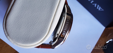 Orologio automatico con fasi lunari di gran classe, si ricarica sia con il movimento del polso oppure direttamente anche dalla coroncina ed è un modello scheletron cioè con tutti gli ingranaggi visibili sia dalla parte frontale del quadrante che da quella posteriore utilizzato per sole 3 volte è in condizioni fantastiche senza un graffio e preciso al Millesimo, dispone anche del quadrante con le fasi lunari giorno notte e il sole e la luna disegnati, pari al nuovo la confezione esterna è in pregiato legno con con le venature che una volta però scattata la foto sembrano graffi in realtà sono bellissime venature del legno, se occorrono altre informazioni o foto non esitate a contattarmi ve le invierò direttamente. possibilità di vederlo di persona Se siete in zona o spedizione tracciata inclusa nel prezzo