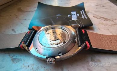 Come da titolo, orologio automatico con movimento a vista NH 35 tenuto in collezione e usato in un paio di occasioni , pertanto condizioni eccellenti. Il cinturino è in pelle prodotto in Italia di alta qualità. Completo di scatola e libretto. Cassa a cuscinetto che richiama un forte stile anni 70. Caratteristiche : Diametro cassa : 40 mm esclusa corona, cassa in acciaio 304 Cinturino: pelle made in Italy Corona: a vite Indici: super luminova Resistenza all'acqua : 50m 5 atm Movimento: automatico Seiko NH 35 Vetro: minerale