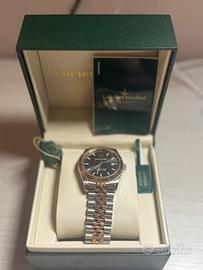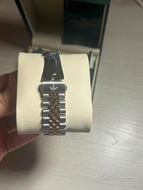 Materiale:Cassa e cinturino in acciaio con dettagli e lunetta (ghiera) color oro rosa.