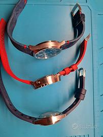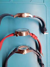 Mi sono appassionato all'orologeria meccanica e prima di metter mano a orologi vintage ho iniziato moddando e assemblando orologi personalizzati. Per sfoltire un po' la mia collezione, propongo a un prezzo pressoché simbolico tre pezzi. 1) Diver | orologio subacqueo, impermeabile 300 m, cassa inox tipo Seiko Tuna, ghiera unidirezionale ceramica, vetro zaffiro, movimento automatico Seiko NH35, cinturino in gomma rosso. Ne ho testato l'impermeabilità con apposita capsula, sia a 2 bar sia a 8 bar. Euro 80. 2) Pilot, cassa inox, vetro zaffiro, movimento manuale Seagull tipo Unitas 6498, cinturino in pelle blu con cuciture rosse. Molto bello, con secondina a ore 6 scelta con le sembianze dell'elica di un aeroplano. Euro 70. 3) Misterioso, impermeabile 100 m, cassa inox, vetro zaffiro, movimento automatico Seiko NH38 (no data), cinturino in gomma blu. Particolari le lancette, costituite da tre livelli di intrecci geometrici; l'ora si riesce a leggere, tranquilli, basta notare i triangoli bianchi. E' un bell'oggetto che desta curiosità. Euro 70. Ognuno di questi orologi ha anche il mio simbolo, fabbricato a disegno ed elettroplaccato. Ovviamente sono tutti perfettamente funzionanti e con pochissimi segni di usura. Tenete conto che il prezzo di vendita non copre nemmeno il costo dei singoli componenti: siamo a meno della metà del loro valore reale! Ma devo fare un po' di spazio nel cassetto! Se siete interessati a un modello mi contattate e vi mando qualche altra foto. Sempre preferibile la consegna a mano, così controllate le funzionalità ma posso tranquillamente anche spedire.