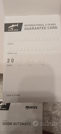 orologio subacqueo 1000m certificato iso6425, con movimento automatico Seiko nh35 dotato di Fermo macchina e carica manuale, in edizione limitata Chris Benz, nuovo, Mares modello Mission 1000, diametro della cassa 45 mm escluso Corona e Valvola meccanica di scarico dell'elio, Corona e fondello a vite, vetro in Zaffiro durezza 9, cassa in acciaio inossidabile Marino, Lunetta girevole unidirezionale da 120 scatti, cinturino in gomma con Incisa tabella di decompressione americana, dotato di scatola originale a forma di bombola da sub e contro scatola in cartone, manuale e certificato di garanzia non vidimato.
