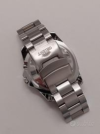 Orologio automatico ORIENT Mako XL, referenza EM75002D, stile diver subacqueo da uomo. Quadrante e lunetta di colore blu. Orologio in ottime condizioni, indossato poche volte e perfettamente funzionante. Presenta lievi segni dovuti al normale utilizzo. Completo di scatola e maglie. Caratteristiche: Movimento automatico giapponese calibro 46943 21 rubini Bracciale e cassa in acciaio inox con chiusura deployante con pulsante e logo Fondello a vite in acciaio inox con logo Dimensioni 44 × 50 × 14 mm, esclusa la corona Vetro minerale antigraffio Quadrante colore blu Lancette e indici luminescenti al buio Datario automatico a ore 3 Indicazione del giorno della settimana e della data a ore 3 Lunetta girevole unidirezionale in acciaio inox Corona a vite Pulsante per regolare il giorno della settimana Impermeabilità fino a 200 metri / 20 bar Riserva di carica superiore a 40 ore Peso circa 200 g