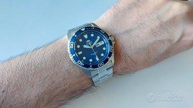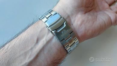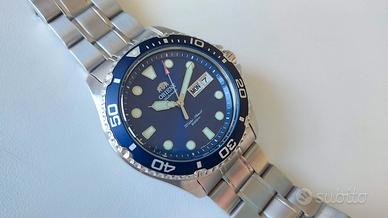 Vendo Orient Ray 2 automatico in ottimo stato. Senza graffi. Orologio sportivo da uomo con cassa tonda in acciaio INOX grigio argento di 42mm, Vetro minerale e corona a vite; quadrante blu e cinturino coordinato in acciaio INOX. Movimento meccanico F6922 con 22 rubini, display a 3 sfere e calendario giorno-data. Accuratezza quotidiana +25/-15, carica manuale e automatico inclusi. Resiste all'acqua fino a 200m. Valuto scambio esclusivamente con Orient Bambino 38 mm.