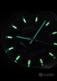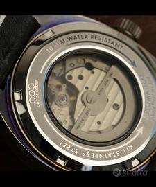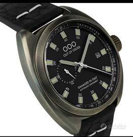 Movimento automatico Miyota 8217. Cassa da 42mm in acciaio inossidabile con trattamento di invecchiamento brevettato OOO. Quadrante nero opaco con anello Rehaut con tachimetro. Indici applicati con super luminova. Corona a vite logata. Vetro bombato e movimento a vista. Impermeabile 100 MT. Cinturino in vera pelle conciata al vegetale cucito a mano. Orologio NUOVO, con pellicole e completo di scatola e garanzia. Listino 569 euro. Astenersi da offerte ridicole.