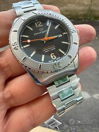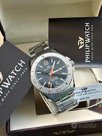 Philip Watch Orologio da uomo, Collezione AMALFI, movimento automatico MVT.STP1-11, tempo e data, in acciaio. L'orologio è caratterizzato da un cinturino in acciaio inossidabile, con fibbia diver con blocco sicurezza. La cassa misura 43mm, incornicia un elegante quadrante colore nero e monta un vetro zaffiro antiriflesso. Resistente all'acqua fino a 30 ATM. L'orologio è contenuto nella sua confezione originale Philip Watch, con garanzia 2 anni. Philip Watch Collezione Amalfi: alti standard qualitativi, manifattura svizzera e forme eleganti compongono l'anima sport-elegant degli orologi Amalfi. Da sempre il mare con i suoi abissi, è fonte d'ispirazione per il mondo sportivo di Philip Watch, oltre che ambiente ideale per la ricerca e la sperimentazione di funzioni e sistemi innovativi.