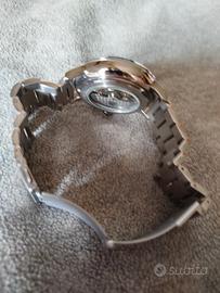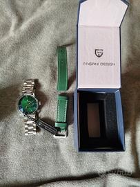 Vendo bellissimo orologio automatico, Pagani Design, quadrante verde smeraldo, vetro minerale, cassa e bracciale in acciaio inox, cinturino in tinta incluso, shock proof, impermeabile 30 metri, fondello a vista, diametro cassa 43 mm, peso 78 gr., larghezza aggancio bracciale 22 mm, completo di confezione originale, acquistato per collezione personale,indossato una sola volta, pari al nuovo, ad euro 79. Visibile in Torino, posso spedire. No a scambi permute o perditempo grazie