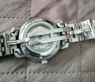 Orologio Roamer Swiss made automatico con quadrante grigio e datario ore 6, cassa acciaio inox dal diametro di mm. 39,8 (escluso corona) e spessore 8 mm., fondello a vista,bracciale in acciaio inossidabile con chiusura a farfalla per una circonferenza polso 19,5 cm., indici applicati, movimento svizzero 25 jewels 5 atm.; l'articolo è corredato da cofanetto generico. L' orologio ha normali segni di utilizzo su vetro, cassa e bracciale; in merito al suo funzionamento perde circa un minuto ogni 24 ore.
