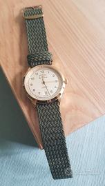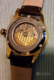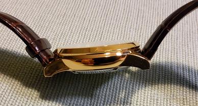 --- RIBASSO TEMPORANEO PER NUOVO PROGETTO!!! --- Vendo per sfoltire la collezione e perché poco indossato ma periodicamente fatto girare per mantenere lubrificato il movimento (Sellita). Questo orologio unisce l'estetica classica e piuttosto elegante ad una grande robustezza e affidabilità (impermeabilità "Dolphin standard" ossia la Casa dichiara che non si avranno problemi con qualsiasi attività acquatica fino a 50 metri di profondità), infatti è dotato di corona e fondello a vite (con oblò trasparente per ammirare il movimento, con rotore personalizzato). Inoltre presenta vetro zaffiro antigraffio, leggermente bombato per evitare riflessi, quadrante champagne con data a ore 6 che dona una piacevole simmetria, indici a numeri arabi e piccoli dot che si illuminano al buio, così come le lancette di ore e minuti. La cassa in acciaio è color oro con trattatamento PVD ed ha una forma originalmente sinuosa, come si vede dalle foto laterali. Diametro 40 mm e spessore 10,7 mm. Cinturino originale in pelle marrone, con fibbia logata, e aggiunto cinturino "perlon" verde. Prezzo di listino superiore ai 600 euro, e attualmente fuori produzione. Un orologio di qualità che si può tranquillamente indossare tutti i giorni.