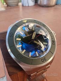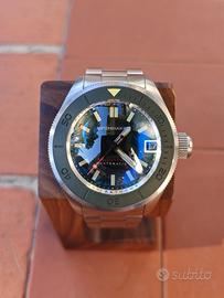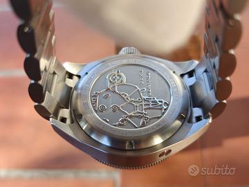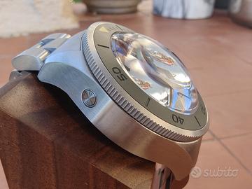 Non hai bisogno di un orologio, hai bisogno di una dichiarazione al polso? Allora preparati, perché lo Spinnaker Piccard non è un orologio, è un'affermazione! Immagina questo: una "bestia da immersione" con un vetro bombato che è talmente esagerato da far sembrare i tuoi altri orologi piatti. É come avere un piccolo sottomarino al polso che, stranamente, ti rende anche incredibilmente elegante. E ti fa leggere l'ora come nessuno mai! Sotto il cofano batte un affidabilissimo movimento Seiko NH35, perché la precisione è importante, anche quando stai sfoggiando un orologio che sembra pronto per una missione lunare. Corona fluida che si blocca saldamente , Lunetta rigida ma affidabile. É un subacqueo, non un ciondolo! E quel verde militare è la tonalità che fa girare la testa. Okay, ammettiamolo é inusuale. Ma è anche stranamente comodo, bello, iconico e garantito per farti ricevere più complimenti di quanti ne riceverebbe un cagnolino con un tutù. Non è per i deboli di polso, è per chi ama gli orologi imponenti, quelli che hanno carattere da vendere. L'ho adorato, davvero! Ma, ahimè, i miei gusti si sono orientati verso un nuovo Breitling (non fatemi domande, è una storia lunga, ma il secondo divorzio non me lo leva nessuno se non sfoltisco almeno 10 orologi della collezione). Quindi, la mia perdita è la tua incredibile opportunità! Viene spedito con tutto il corredo: scatola, cartellino e tutte le maglie. Anche se preferirei la consegna a mano per mostrarti questa meraviglia. NO contrassegno NO truffatori NO "Furio" (cit.) NO zanza che perdono tempo a fare offerte e poi si dileguano come pinguini perchè nel frattempo la zia si é rotta il femore, perchè c'è stata l'invasione di locuste, perchè stanno andando al battesimo del nipote del vicino.