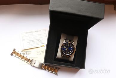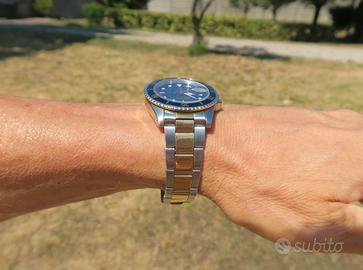 Elegante orologio sub a movimento meccanico 21.600 alternanze/ora con carica automatica, bracciale sportivo e robusto tipo Oyster a tre maglie acciao con laccatura oro e chiusura di sicurezza, ghiera unidirezionale 60 scatti in senso antiorario a scala sessagesimale 5 minuti, corona e fondello a vite, impermeabilità 100 metri, data a ore 3 con lente, cassa 40 mm, vetro minerale. Quadrante e ghiera blu mare, indici in rilevo.