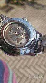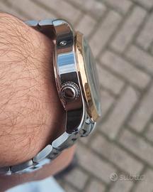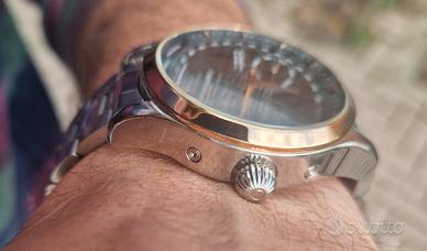 Orologio automatico Theorema prodotto in Germania. Il segnatempo presenta un quadrante multifunzione con complicazioni e un fondello a vista. L'orologio, in se, è perfetto. Nessun graffio. Il bracciale originale è stato sostituito con un modello Sector in acciaio inossidabile che mostra segni di usura da utilizzo ordinario. Specifiche Tecniche Movimento: Meccanico automatico, 35 rubini. Complicazioni: Giorno della settimana (ore 9), mese (ore 3), indicatore 24 ore (ore 6) e datario a cerchio esterno. World Time: Ghiera interna rotante con città mondiali regolabile tramite corona a ore 8. Dimensioni: Diametro cassa 43 mm (esclusa corona). Materiali e Identificazione Cassa: Acciaio con lunetta fissa dorata. Fondello: Serrato a vite con oblò in vetro minerale. Bracciale: Sector a maglie in acciaio. Impermeabilità: Classificazione 3 ATM. Referenza: T3001. Condizioni Stato: Meccanica funzionante. Usura: Abrasioni superficiali presenti esclusivamente sul bracciale. Tissot, Seiko, Orient, Citizen, Hamilton, Bulova, Longines, Oris, Junghans, Zeppelin, Graf, Montblanc, Breitling, Omega, Rolex, Tudor, IWC, Sinn, Stowa, Nomos, Glashütte, Mido, Certina, Alpina, Frederique, Constant, Maurice, Lacroix, Raymond, Weil, Movado, Rado, Victorinox, Wenger, Laco, Archimede, Damasko, Muhle, Hanowa, Mondaine, Festina, Fossil, Invicta, Stuhrling, Akribos, Parnis, Sea-Gull, Miyota, Valjoux, ETA.