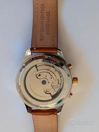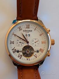 orologio uomo automatico usato Kinyued , condizioni e funzionamento perfetto, cinturino in pelle marrone , fibbia cinturino dorata, che si abbina alla corona, pulsanti data , e cornice superiore della cassa , come da foto, diametro cassa mm 44 , cinturino mm 20