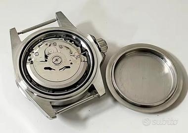 orologio assemblato stile submariner vintage, senza loghi. vetro minerale effetto plexi bombato, ghiera girevole verde, cassa 40mm in acciaio di alta qualità con fori, movimento automatico Seiko NH35, cinturino nato nero. nuovo!
