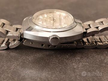 Questo modello incarna perfettamente lo stile dell'epoca con la sua robusta cassa "cushion" (a cuscino) in acciaio inossidabile e un bracciale integrato che si raccorda perfettamente al design della cassa. Movimento meccanico a carica automatica di alta qualità (21 Jewels), molto fluido e preciso nel tempo (non revisionato recentemente ma funzionante) Complicazione Rara: Sistema di cambio data rapido "a pompa" (Quickset). La data scatta tirando la corona verso l'esterno perfettamente funzionante. Cassa interamente in acciaio inox con finitura lucida/satinata ancora ben definita. Protetto da sistema "Antichoc". Ideale per polso femminile o come pezzo da collezione unisex di piccolo diametro. L'orologio è stato testato e marcia con regolarità. Il vetro plexy è limpido e privo di graffi profondi. Un pezzo di sostanza, ideale per chi cerca un orologio automatico svizzero d'epoca con una complicazione meccanica affascinante e poco comune. Prezzo trattabile Scambio valutabile con Casio Seiko Citizen Orient Archs Bulova pryngeps vintage cronografo meccanico quarzo digitale o automatico anche da sistemare sempre vintage