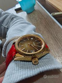 Orologio automatico vintage Vetta, perfettamente funzionante ma non so quando ha subito l'ultima revisione. corona a vite e datario ad ore 3 tutto perfettamente funzionante, oltre al bracciale in pelle rosso(After market) è disponibile il suo bracciale originale ma con un solo coprianse. diametro di circa 36mm può andar bene sia per uomo, se con un polso nn troppo importante, che per donna