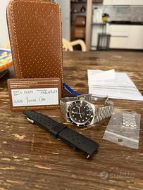 Orologio Automatico Yema Pearl Diver YCL1.MRM Revisionato Full Set. Splendido diver della maison francese in ottime condizioni di funzionamento Cassa da 38mm, misura perfetta per ogni polso Dial nero con indici e lancette colorati che, in combinazione con il caratteristico freccione della lancetta dei minuti, donano un aspetto vintage Lunetta alluminio lucido Vetro esalite Calibro di manifattura YEMA2000 Corona e fondello a vite Fondello inciso Doppio cinturino, acciaio con tutte le maglie e in gomma entrambi originali Full set Revisionato dicembre 2025