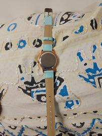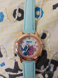 vendo orologio al quarzo per bambina nuovo mai usato nel suo cellophane originale cinturino in similpelle azzurro cassa rotonda rosé con strass e disegno di Lilo e stich