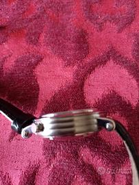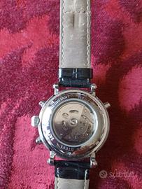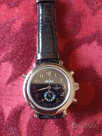 Orologio Rene Barton Automatic , con movimento a carica automatica, cassa in acciaio, quadrante nero con numeri arabi, finestre con giorno della settimana e mese alle ore 13 e indicatore delle fasi lunari alle ore 6. Cinturino in pelle nera dotato di chiusura automatica. Modello molto bello e raro perché non più in produzione.
