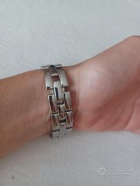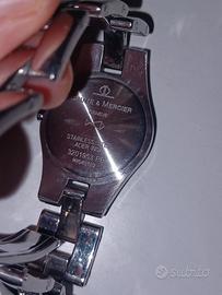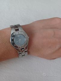 Orologio da donna BAUME & MERCIER, in acciaio anno 2000, usato. Orologio da donna Baume & Mercier in acciaio. Cassa rotonda in acciaio, fondo cassa avvitato, corona scanalata.Q uadrante in madreperla e blu, movimento al quarzoL.ancette Dauphine in acciaio.Cinturino in acciaio, chiusura a scomparsa in acciaio firmata Baume & Mercier. No scatola originale No garanzia.