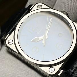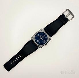 Fondo blu, cinturino pelle blu. Scatola/t con secondo cinturino sport/tessuto (mai montato) accessori e documenti.