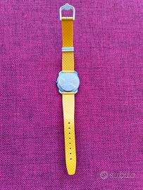 Orologio vintage **Benetton by Bulova** della collezione *Time of the World*, prodotto negli anni '90. Questo orologio unisex ha un design unico con quadrante nero e scritta Benetton, associato a un cinturino giallo in gomma che lo rende casual e colorato. La cassa in metallo con fondello in acciaio inossidabile conferisce robustezza e durata. Il movimento è al quarzo, e l'orologio è resistente all'acqua. Perfetto per collezionisti o appassionati di moda vintage.