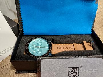 Orologio cronografo analogico da uomo BY BENYAR con cinturino in pelle marrone e quadrante azzurro/argento. Nuovo in confezione originale,vendo. N:B: L'orologio seppur nuovo,mai usato,non funziona,pertanto da riparare o per pezzi di ricambio.