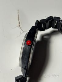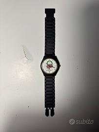 Il movimento è al quarzo di produzione svizzera, con una corona di regolazione rossa a contrasto posizionata a ore 3. Il bracciale presenta una chiusura a scatto regolabile in materiale plastico coordinato. L'orologio si presenta in buone condizioni estetiche generali, con minimi segni di utilizzo sulla cassa e sul vetro acrilico che non ne compromettono la particolare estetica.