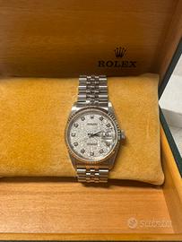 Vendo Rolex Datejust 36 ref. 16234, quadrante argento “Computer” con diamanti originali, ghiera zigrinata in oro bianco 18kt e bracciale Jubilee. Acquistato a luglio 2025 presso Della Rocca Gioielli (Bologna). Indossato pochissimo, condizioni eccellenti. Completo di scatola, documenti di acquisto e certificazione di autenticità. Vendo per cambio modello