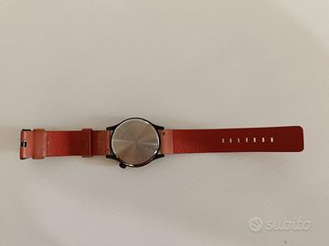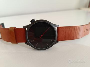 Quadrante nero opaco con indici e sfere ore e minuti in metallo nero leggermenteb lucido e sfera secondi rossa.