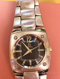 L'orologio mostrato è un modello Breil della collezione Wide, caratterizzato da una cassa e un bracciale in acciaio inossidabile e un design squadrato distintivo con viti a vista sulla lunetta.