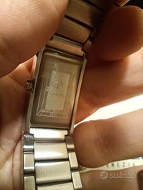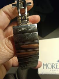 OrologioBreil Milanoda donna. L'orologio presenta una cassa rettangolare e un cinturino a bande in acciaio lucido. Il quadrante analogico bianco ha numeri stilizzati alle posizioni 3, 6, 9 e 12, con il logo "e" di Breil posizionato al centro. Collezione "b" o slash.