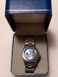 Appartenente a una delle collezioni storiche e più apprezzate del marchio. Cronografo al quarzo. Materiale: Interamente realizzato in acciaio inossidabile lucido e satinato. Quadrante: Di colore blu riflettente (sunray), con tre sotto-quadranti per le funzioni cronografiche (minuti, secondi e decimi di secondo o indicazione 24 ore). Lunetta: Ghiera fissa con scala tachimetrica (utilizzata per misurare la velocità media su una distanza nota), di colore blu coordinato al quadrante. Cinturino: Bracciale in acciaio con maglie a tre file e chiusura di sicurezza. Movimento: Movimento al quarzo ad alta precisione (solitamente Miyota). Funzioni: Ore, minuti, secondi, cronografo e datario (posizionato a ore 4). Resistenza all'acqua: Generalmente certificato per 10 ATM (100 metri), rendendolo adatto all'uso quotidiano e al nuoto. Vetro: Minerale antigraffio.