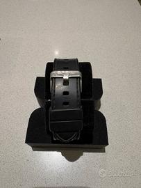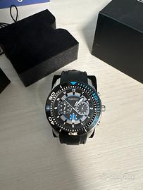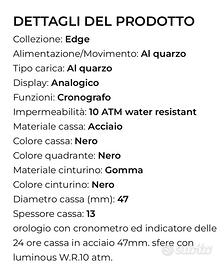 Dettagli: • Cronografo al quarzo • Cassa in acciaio • Display analogico • Quadrante nero con accenti blu • Tre contatori cronografici • Cinturino in gomma • Resistente all'acqua (10 atm) Nuovo, in confezione originale
