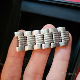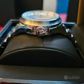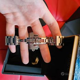 L'orologio possiede movimento quarzo Ronda 5030D e funzione di cronografo. La cassa è in acciaio, ha una dimensione di 40 mm ed è di forma rotonda. Il quadrante è di colore argento, ha indici e lancette di colore nero. Il tutto è protetto dal vetro di tipo minerale e antigraffio. Il cinturino è in acciaio ed ha una chiusura a scomparsa. E' resistente all'acqua fino a 10 atm ed ha la corona chiusa a vite. - Condizioni come nuove - il bracciale è stato stretto ma sono presenti viti e parti rimosse. - posteriormente la cassa presenta ancora la pellicola di fabbrica - la batteria è scarica - la confezione é stata ricoperta da una pellicola perchè col tempo è diventata appicicosa al tatto a causa dei materiali utilizzati - prezzo trattabile, spedisco in 1-2 giorni