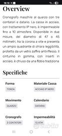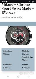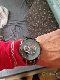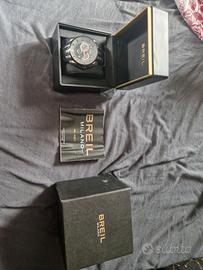 Vendo orologio breil Milano come nuovo, perfettamente funzionante, necessita solo del cambio delle spine dei cinturini che si sono rovinati o meglio piegati e quando indossato rimangono un po aperti, completo di scatola originale e manuale d'istruzione. Orologio con casa d'acciaio 45mm, vetro zaffiro, quadrante nero e rosso, cronografo con funzione di datario, fondello e corona a vite. Valore a nuovo 500 euro, vero affare. Vendo per non utilizzo.