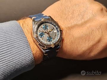 Cassa in acciaio e oro, quadrante blu, cronografo automatico, cinturino in pelle nuovo. Condizioni ottime, perfettamente funzionante, ideale sia per appassionati che per chi cerca un investimento solido.