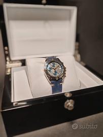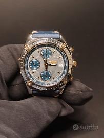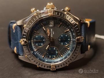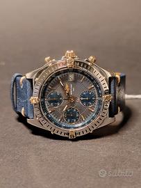 Cassa in acciaio e oro, quadrante blu, cronografo automatico, cinturino in pelle nuovo. Condizioni ottime, perfettamente funzionante, ideale sia per appassionati che per chi cerca un investimento solido.