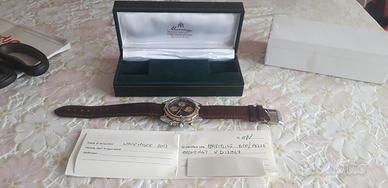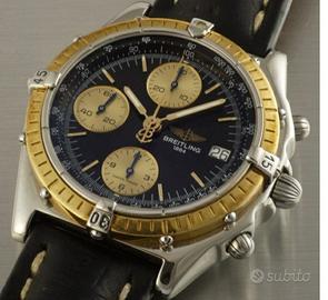 Causa realizzo vendo orologio automatico Breitling Chronomat anni '90. Cassa in acciaio lucido di 39 mm con lunetta in oro giallo 18k, cavalieri in acciaio, bracciale in pelle con fibbia originale. Quadrante blu con contatori e serigrafia in oro, datario a finestrella a ore 3 e con vetro zaffiro.