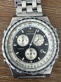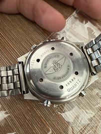 Anno 1989, cassa in acciaio, fondello serrato a vite, tasti del crono a pompa, corona marcata a ore quattro, ghiera girevole zigrinata e graduata a 360 gradi con punti cardinali, quadrante nero con tre contatori argentè, grafica argento, indici luminescenti, secondi a ore sei, datario a ore quattro, movimento al quarzo, bracciale a maglie in acciaio, chiusura marcata Breitling, vetro minerale. Diam. mm 41. Ottime condizioni considerati i suoi quasi 40 anni, perfettamente funzionante; orologio completamente originale, molto ricercato per la sua precisione, impermeabilità e prestigio. NON SPEDISCO.