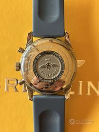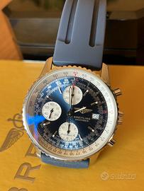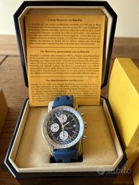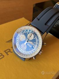 Condizioni ottime, ha la scatola e tutte le carte eccetto il foglio di garanzia. Funzionamento impeccabile. Calibro K13 Breitling su base ETA Valjoux 7750 con 25 rubini. Splendido quadrante blu notte, dalle fotografie è impossibile capire bene le sfumature alla luce naturale. Diametro circa 42 mm. Vetro zaffiro. Fornito col cinturino in silicone che si vede in fotografia, il cocco originale usato, un cinturino di pelle custom (mai usato) e un bracciale pilot in acciaio come l’originale (ma NON è originale Breitling). Chiedo Euro 3800,00. NON accetto scambi di alcun tipo. Accetto esclusivamente pagamento con bonifico istantaneo al momento dello scambio a Brescia, dove l’orologio è visibile. NON spedisco.