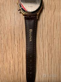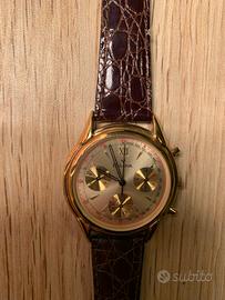 Cinturino marrone in pelle di coccodrillo e chiusura ad ardiglione in acciaio placcato oro giallo.