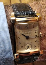 Altre foto disponibili. Orologio Bulova anno 1949 Excellency FF , Art Deco vintage a carica manuale, tank/forma. Laminato oro 10 carati la cassa e il fondello (10K/0.420) numerato 1079197. Movimento 7AK/ETA735 da 21 rubini , 18000 A/h (alternanze/ora) , preciso al cronocomparatore. Sì precisa che orologio non ha alcuna spelatura, è intonso. Altre foto disponibili. Misura mm. 22 corona esclusa x mm. 39 anse comprese. Intatti il vetro a cupola e la cassa, quadrante bianco coevo con numeri arabi a tutte le ore nel font Art Deco, lancetta secondi al sei, lancette o sfere a bastone nel colore blu francese. "Quintuplo segno", cioe' logo su movimento, corona, fondello fronte/retro, quadrante. Cinturino Speidel lucertola mm. 16 alle anse fantasia, gancio dorato ardiglione, per polsi circonferenza da cm. 17 a cm. 21. Prezzo non trattabile, grazie. Spedizione entro un giorno lavorativo da conferma su Tuttosubito o arrivo bonifico bancario. In doppia busta imbottita raccomandata postale A.R. euro 10 , con invio foto e numero ricevuta, per la tracciabilita'. Grazie
