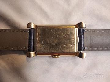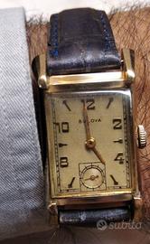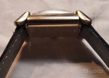 Altre foto disponibili. Orologio Bulova "Sua Eccellenza" modello lungo, Art Deco anno 1949. La marca preferita da Frank Sinatra. Revisionato a ottobre 2024 da oreficeria Moia Daniele di Piacenza, preciso. Movimento a carica manuale 7AK/ETA735 con spirale Breguet da 21 rubini, 18000 A/h (alternanze/ora), misura mm. 23 corona esclusa x mm. 39 anse comprese. Cinturino nuovo in pelle mm. 16 alle anse, gancio ardiglione, per polsi circonferenza da cm. 17 a cm. 21. "Quadruplo segno", cioe' logo su fondello fronte/retro, movimento e quadrante. Cassa, vetro, fondello 7768508 in buone condizioni. Quadrante coevo bianco con numeri arabi applicati al 2-4-8-10-12, indici dorati alle altre ore, lancettina secondi al sei. Laminato oro 10 carati (10K/0.420) , lancette o sfere a bastone. Spedizione in doppia busta imbottita raccomandata postale euro 10. Prezzo non trattabile, grazie. Invio entro un giorno lavorativo da conferma pagamento, con mail foto ricevuta e numero per la tracciabilita', grazie.