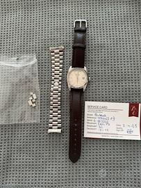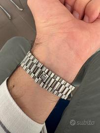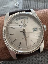 Stupendo orologio vintage Bulova day date automatico 36 mm Anni 80, ottime condizioni! Bracciale adatto per polsi fino a 17,3 cm circa. Perfettamente funzionante, vetro perfetto, solo normali harlines di utilizzo per un orologio di oltre 40 anni. Revisionato ad aprile 2025, con garanzia. Allego cinturino in pelle in regalo.