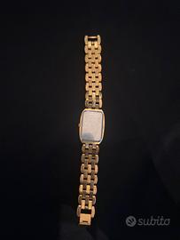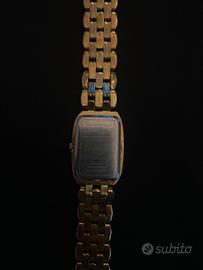 Modello elegante color oro, con quadrante rettangolare e cinturino in metallo dorato.