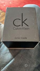 Vendo orologio Calvin Klein Swiss Made originale, modello rettangolare elegante con cassa in acciaio silver, quadrante nero minimalista (logo CK Calvin Klein in alto, Swiss Made in basso), cinturino in pelle nera. È praticamente nuovo, mai usato, completo di scatola originale e istruzioni.