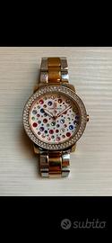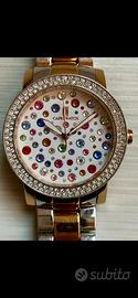 Swarovski di vari colori e dimensioni, ghiera da 38 mm in acciaio arricchita da cristalli bianchi, cassa e cinturino a maglie bimetal acciaio e acciaio placcato oro rosa.