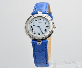 La corona, elemento iconico di Cartier, è impreziosita dal suo caratteristico cabochon in zaffiro blu, un dettaglio lussuoso che sottolinea l’attenzione al particolare della Maison.