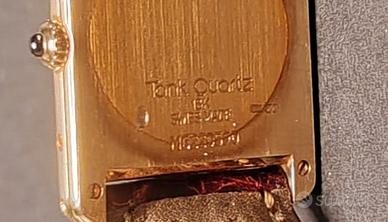 Stupendo Cartier Tank Quartz con cassa in oro 18k, design rettangolare tipico della maison, quadrante chiaro con numeri romani, sfere azzurrate e corona cabochon blu. Segnatempo dotato di movimento al quarzo Swiss Made, preciso e affidabile.