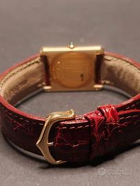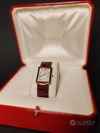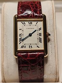 Completo di scatola originale, cinturino in pelle color bordeaux e chiusura classica in oro 18k. Le proporzioni compatte e il profilo elegante rendono questo Tank versatile per ogni occasione – perfetto per chi predilige lo stile sobrio, ma di grande impatto.